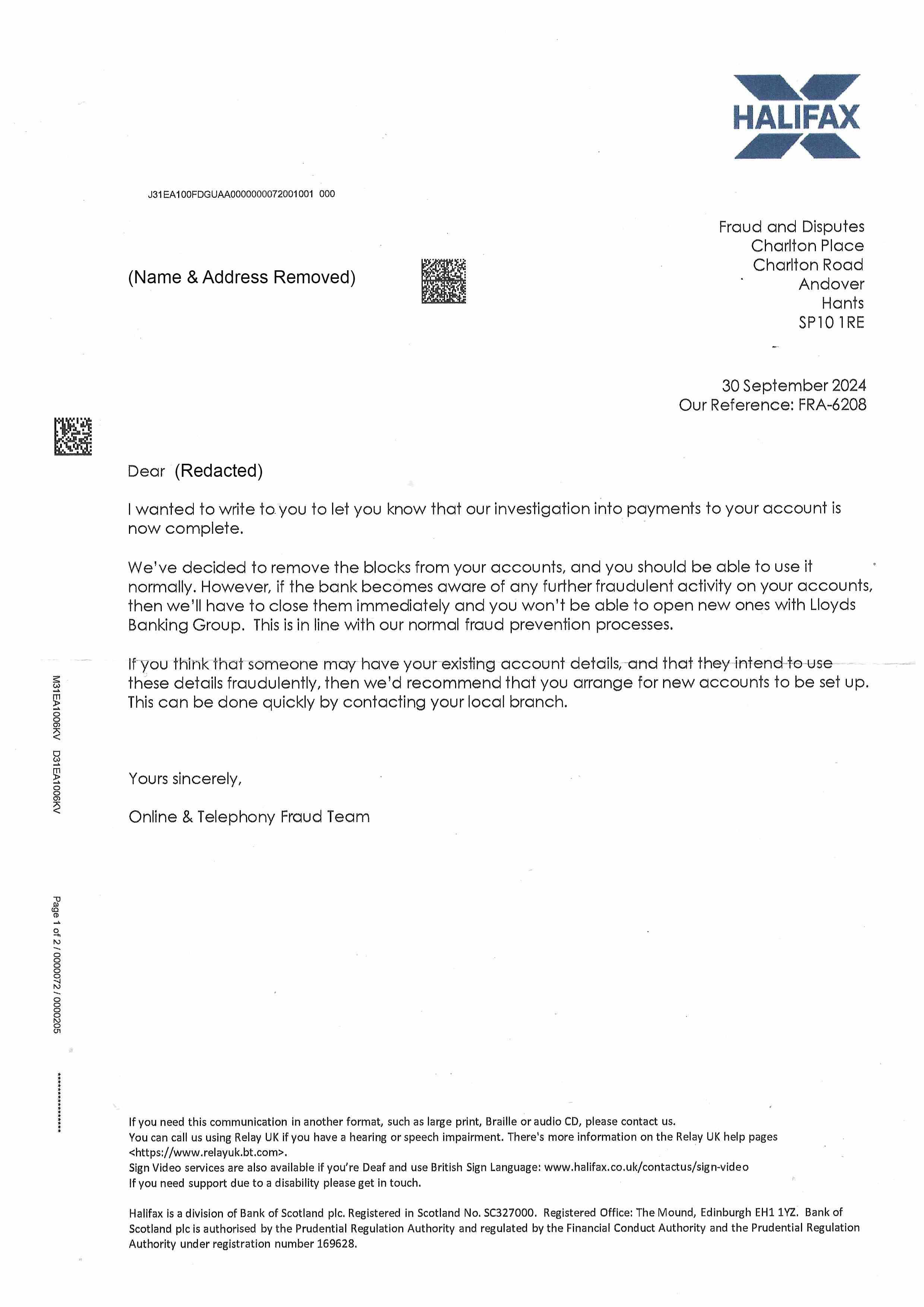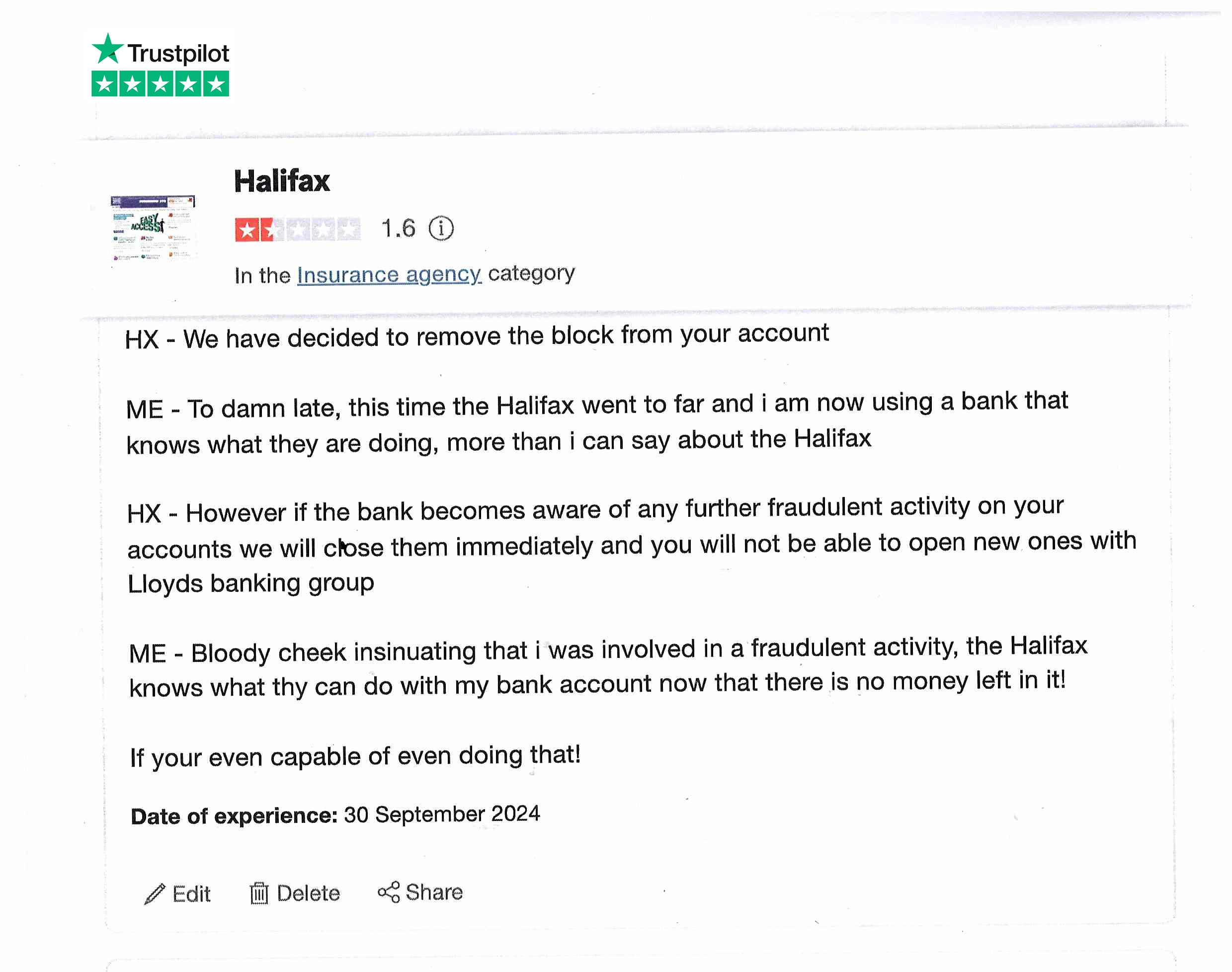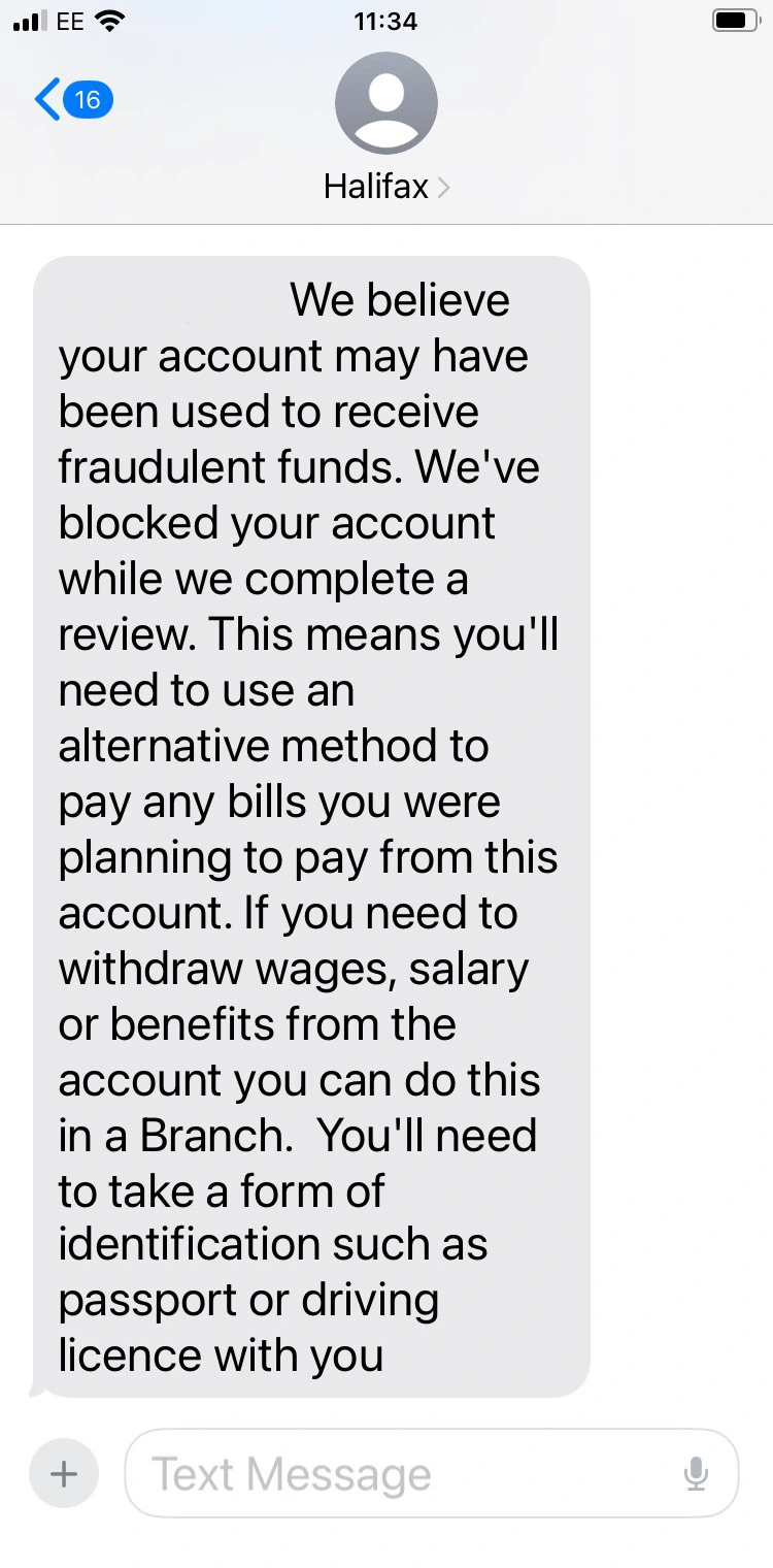 I then received a text message from the Halifax as follows: "Mr. (Redacted), we believe your account may have been used to receive fraudulent funds. We've blocked your account. Why did we complete a review? This means you will need to use an alternative method to pay any bills you were planning to pay from this account. If you need to withdraw wages, salary, or benefits from your account, you can do this in a branch. You will need to take a form of ID such as a passport or driving license with you. There was no contact information with this message; I thought it was a scam but phoned the Halifax and was put through to the fraud section, where I spent the next 1 hour, 14 minutes. I gave the full details of what had transpired with the buyer, who had obviously done as she had stated gone to her bank. The person taking this information informed me it would be submitted to the investigation team. The following morning, I called the Halifax and the block was still there! Three more times during the day, I was informed it was still blocked! So on Monday I would do as the message had told me to do and went to the Halifax bank for a 40-minute drive, costing me £15 an hour for the driver whilst he waited and to bring me back home... to ensure this was not to be a wasted journey. On Monday morning, I called the Halifax and was informed the block was still on but was told I could withdraw and close the account. Upon arrival at the bank, I am told, "No, you can't close the account until we have contacted the fraud department." I asked what happens if, and when you get through, you are informed that the block is still there and I can't get any money out of my account to even buy food with. I am then told the block has been lifted! when?  This morning, what time? I don't know! How many other people have had similar problems with the Halifax?