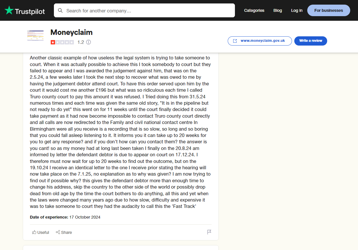 Another classic example of how useless the legal system is trying to take someone to court. When it was actually possible to achieve this I took somebody to court but they failed to appear and I was awarded the judgement against him, that was on the 2.5.24, a few weeks later I took the next step to recover what was owed to me by having the judgement debtor attend court. To have this order served upon him by the court it would cost me another £196 but what was so ridiculous each time I called Truro county court to pay this amount it was refused. I Tried doing this from 31.5.24 numerous times and each time was given the same old story, "It is in the pipeline but not ready to do yet" this went on for 11 weeks until the court finally decided it could take payment as it had now become impossible to contact Truro county court directly and all calls are now redirected to the Family and civil national contact centre In Birmingham were all you receive is a recording that is so slow, so long and so boring that you could fall asleep listening to it.