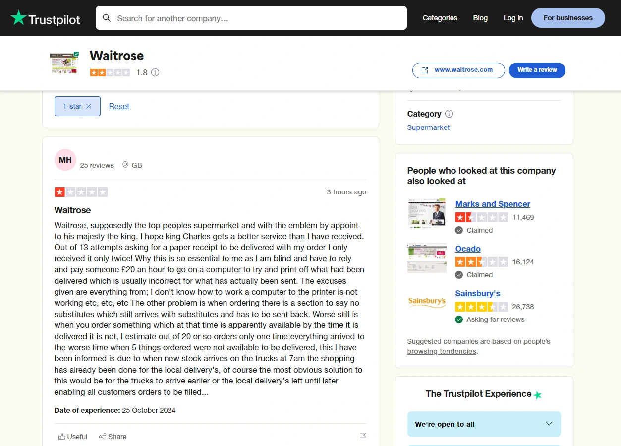 Waitrose, supposedly the top peoples supermarket and with the emblem by appoint to his majesty the king. I hope king Charles gets a better service than I have received. Out of 13 attempts asking for a paper receipt to be delivered with my order I only received it only twice! Why this is so essential to me as I am blind and have to rely and pay someone £20 an hour to go on a computer to try and print off what had been delivered which is usually incorrect for what has actually been sent.